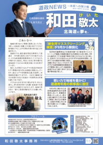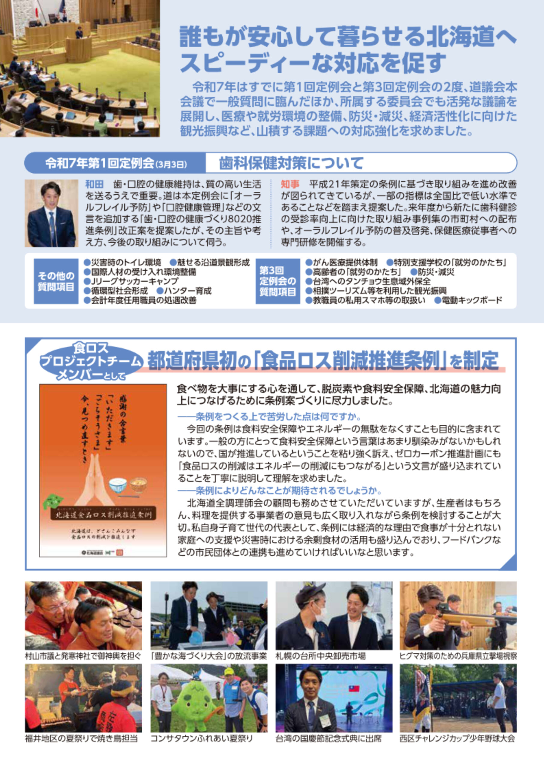 札幌市西区で生まれ育った私は、常に先を見据えた「常先一歩」の政治で、ふるさとが子どもからお年寄りまですべての人が笑顔で暮らせる住みよい地域であり続ける為に道政への挑戦を決意いしました北海道では人口減少の進展に伴い、子育て医療・福祉、介護、建設業、農林水産業など、さまざまな分野で深刻な労働力不足に直面しています。 また、新型コロナウイルスや物価高騰などにより先行きが不透明さを増すなか、北海道の存在価値を高値るため時代に即した形で地域の魅力や可能性を育て『強い北海道づくり』を一日も早く進めて行くいくことが今、求められていると考えています。子どもからお年寄りまで明るい未来に夢を描けるような『新しい北海道・札幌』に向けて、皆さまの声にしっかり耳を傾けながら全力で活動していきます。未熟な部分もごさいますが、ご指導を賜りますよう心からお願い申し上げます。 札幌市西区で生まれ育った私は、常に先を見据えた「常先一歩」の政治で、ふるさとが子どもからお年寄りまですべての人が笑顔で暮らせる住みよい地域であり続ける為に道政への挑戦を決意いしました北海道では人口減少の進展に伴い、子育て医療・福祉、介護、建設業、農林水産業など、さまざまな分野で深刻な労働力不足に直面しています。 また、新型コロナウイルスや物価高騰などにより先行きが不透明さを増すなか、北海道の存在価値を高値るため時代に即した形で地域の魅力や可能性を育て『強い北海道づくり』を一日も早く進めて行くいくことが今、求められていると考えています。 子どもからお年寄りまで明るい未来に夢を描けるような『新しい北海道・札幌』に向けて、皆さまの声にしっかり耳を傾けながら全力で活動していきます。 未熟な部分もごさいますが、ご指導を賜りますよう心からお願い申し上げます。 HPをリニューアル致しました 2025年4月9日 202511 ● 昭和58年7月25日 札幌市西区生まれ● 札幌市市立手稲東小学校、手稲東中学校 卒業● 立命館慶祥高校、立命館大学文学部 卒業小学校で始めた野球を大学まで継続する。(高校では主将を経験)● 平成18年~平成29年株式会社北洋銀行 勤務● 平成29年~道議会議員和田敬友 秘書会社福祉法人愛敬園 理事(手稲東保育園、手稲曙保育園、北愛敬館)● 自由民主党北海道札幌市西区二支部 副支部長● 札幌西リトルシニアコーチ(中学硬式野球チーム)● 立命館慶祥中学校・高等学校 同窓会 副会長● 家族/妻、長女、長男、次男● 趣味/野球、スキー、スポーツ鑑賞● 資格/教論一種免許(高校国語・中学国語) 小学校から大学まで野球一筋。高校では主将を務め継続することの大切さや仲間への思いやりを学ぶと同時に支えてくれる方々への「感謝」の気持ちを持つこともできました。現在も少年野球チームのコーチとして子供たちの指導にあたってます。 祖父(勝之)父(敬友)は道議会議員、先祖には札幌の村長もおり幼いころから身近な存在でした。地域のために奔走する父の姿を見るうちに「自分を育ててくれたふるさとに恩返しがしたい」という気持ちが芽生え、それが政治を志す原動力になりました。 小学校から大学まで野球一筋。高校では主将を務め継続することの大切さや仲間への思いやりを学ぶと同時に支えてくれる方々への「感謝」の気持ちを持つこともできました。現在も少年野球チームのコーチとして子供たちの指導にあたってます。 祖父(勝之)父(敬友)は道議会議員、先祖には札幌の村長もおり幼いころから身近な存在でした。地域のために奔走する父の姿を見るうちに「自分を育ててくれたふるさとに恩返しがしたい」という気持ちが芽生え、それが政治を志す原動力になりました。